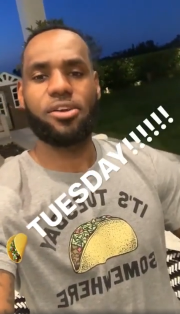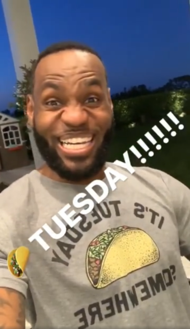 今天,詹姆斯更新Instagram Story,自拍展示他享用Taco(玉米卷)的动态。