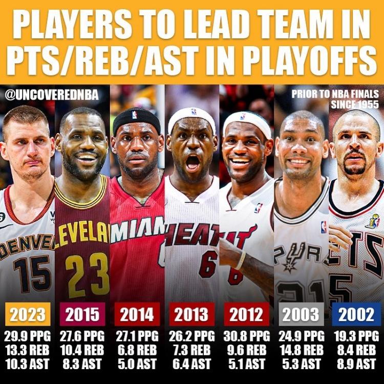 直播吧9月25日讯 外媒uncoverednba今日晒出1955年,单赛季季后赛领跑全队得分、助攻、篮板的球员名单,詹姆斯独占四席,详情如下(按年份排序):