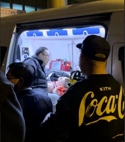 直播吧3月2日讯 CBA常规赛,天津对阵广厦的比赛中,天津外援大卫-詹姆斯重伤倒地,被担架抬出送往医院。