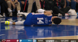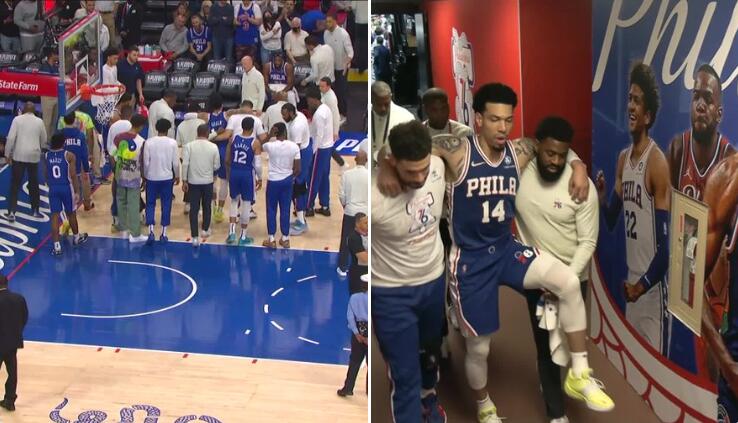 比赛刚开打3分钟,乔尔-恩比德突破单打倒地,导致丹尼-格林左腿(或左膝)受伤,后者痛苦不堪,被队友们抬回更衣室。