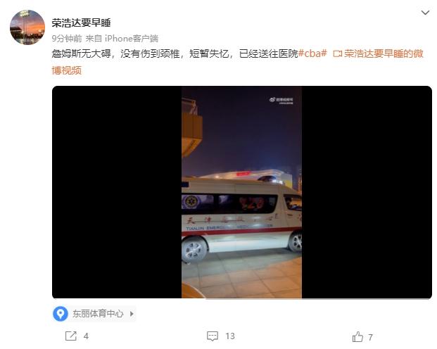 据网友“荣浩达要早睡”爆料,詹姆斯无大碍,没有伤到颈椎,短暂失忆,已经送往医院。