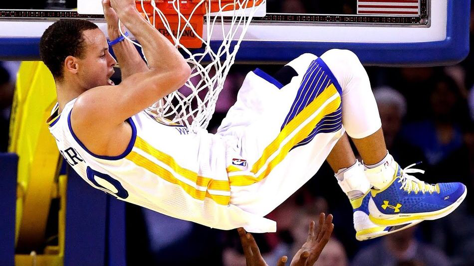 库里虽然身高超过了1米9,但他实战扣篮的概率也就比西蒙斯进三分的概率大了那么点。对他而言,被篮筐封盖才是一种常态。