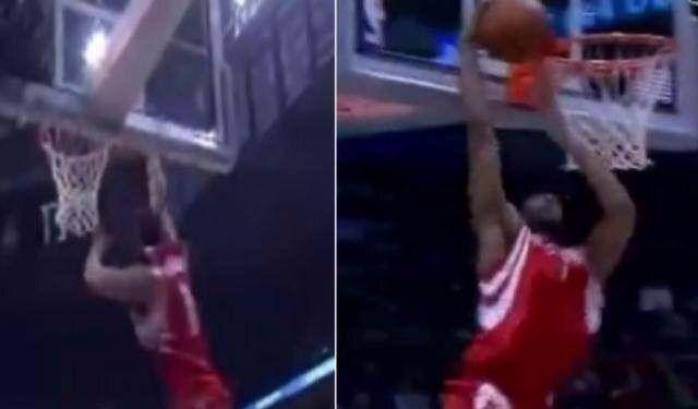 哪怕是对手都放他进去扣篮,结果还是被篮筐结结实实给帽了下来。