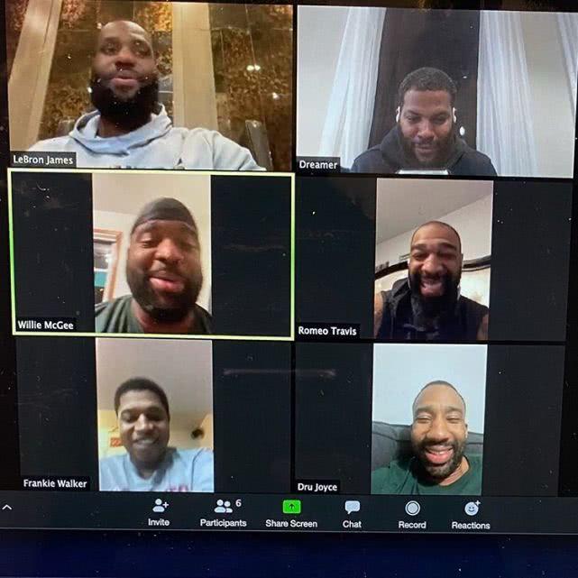 出现在视频上的包括德鲁-乔伊斯三世、罗密欧-特拉维斯、威利-麦基这三位高中队友,另一位弗兰基-沃克是詹姆斯恩师沃克教练的儿子,詹姆斯儿时曾和他在同一个房间生活很长时间。他们都是从小玩在一起的好兄弟,在居家隔离的特别时期,能够和好友们以这样的方式相聚,詹姆斯也显得特别开心。