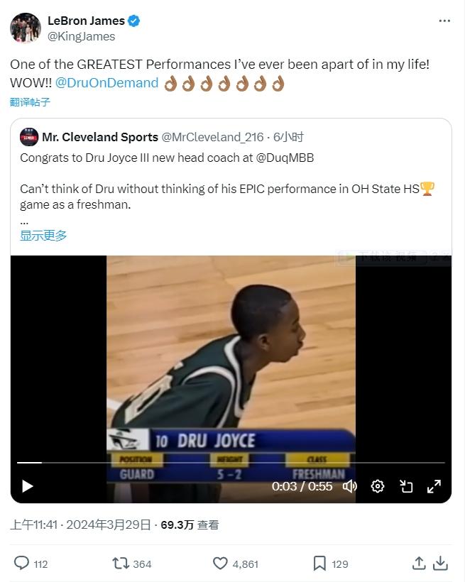 直播吧03月29日讯 詹姆斯高中时期队友德鲁-乔伊斯成为杜肯大学男篮新主教练,詹姆斯转发相关报道对其表示祝贺。