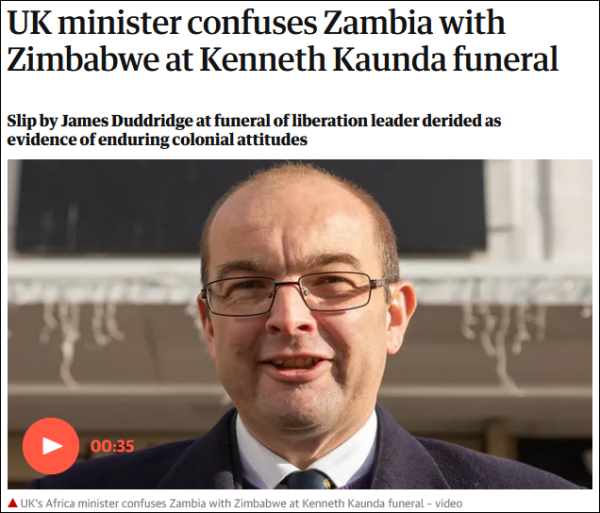 【文/观察者网 熊超然】当地时间6月17日,赞比亚开国总统,同时也是赞比亚国父的卡翁达(Kenneth David Kaunda)逝世,享年97岁。7月2日,他的葬礼在首都卢萨卡举行,前去参加的英国非洲事务大臣詹姆斯·达德里奇(James Duddridge),却闹出了“大乌龙”。