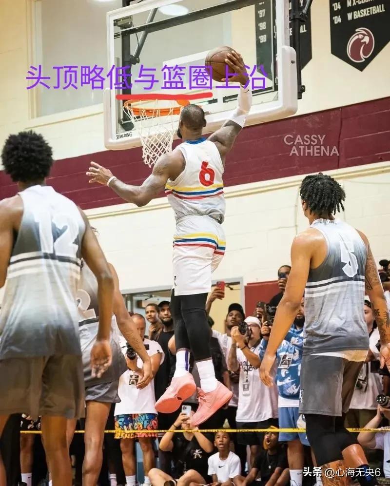这是昨天克6联赛上的现场图,詹姆斯这张扣篮照片拍摄角度偏低,乍一看几乎是头部平框了,实际上差一点点吧,但是很明显詹姆斯的头顶到了篮筐的下沿,也就是篮网的上沿,超过篮板的底沿,目测3米没问题(篮圈3.05米),你相信这是38岁中年男人的弹跳力?
