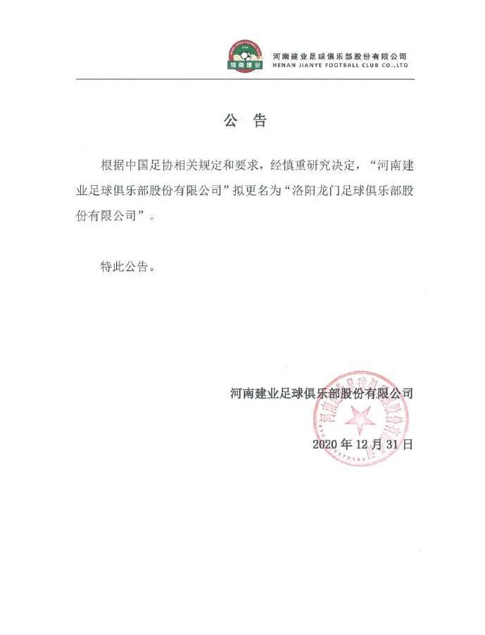 2020年12月31日下午,建业俱乐部的公告来的很突然,响应足协关于俱乐部改中姓名的要求,俱乐部拟将新名字定为“洛阳龙门足球俱乐部”。不单是球迷和媒体感到无法置信和意外,甚至俱乐部内部的员工也是在当天下午公告临近发布之前两三个小时,才得到的这个消息,谁也没想到会跟洛阳和龙门有关。