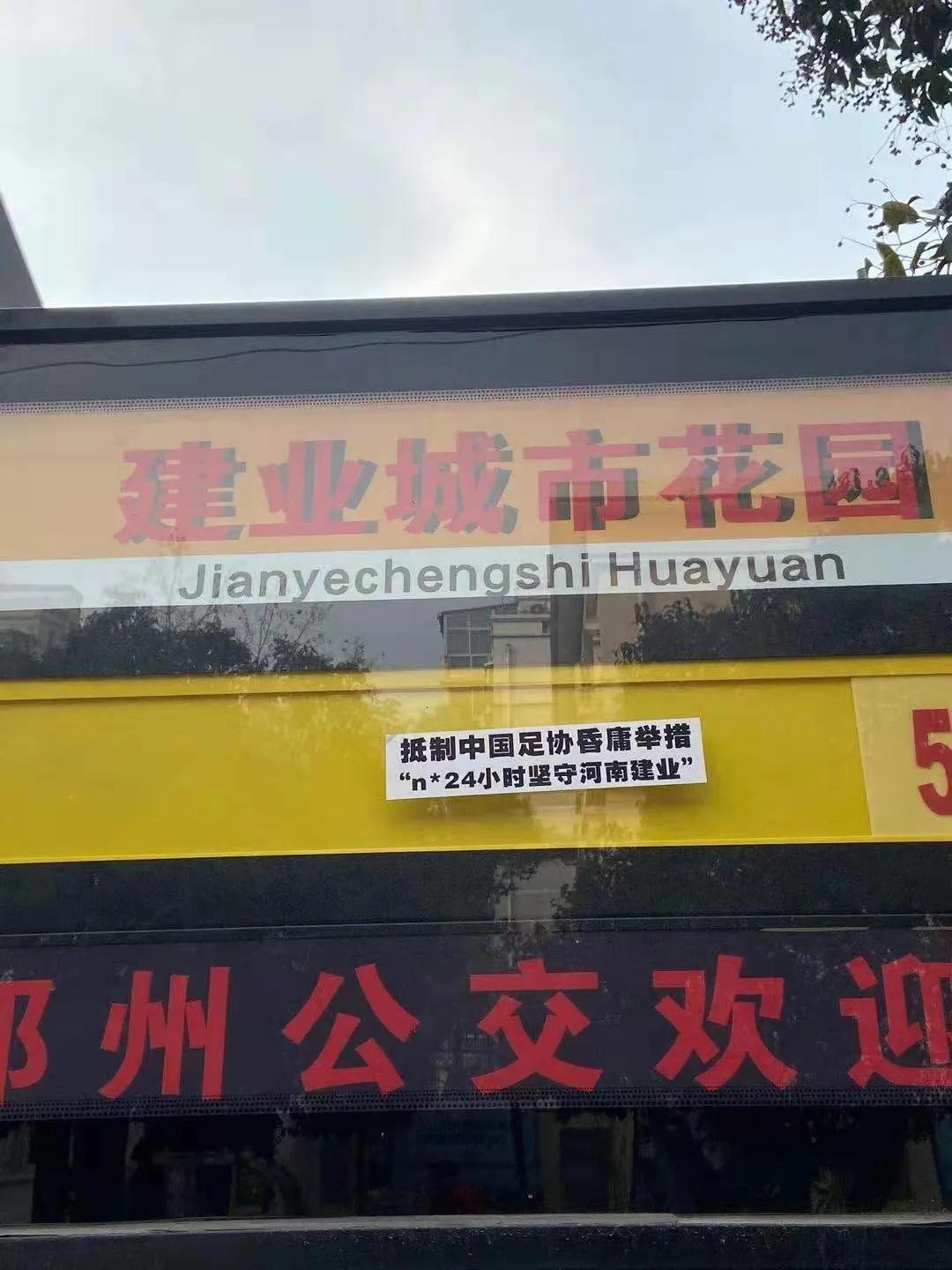 在焦灼的等待中,建业球迷没有闲着,他们在所有能想到的与建业和足球相关的场合,都贴出印有“抵制中国足协昏庸举措,n*24小时坚守河南建业”的纸牌,这其中甚至包括足协。