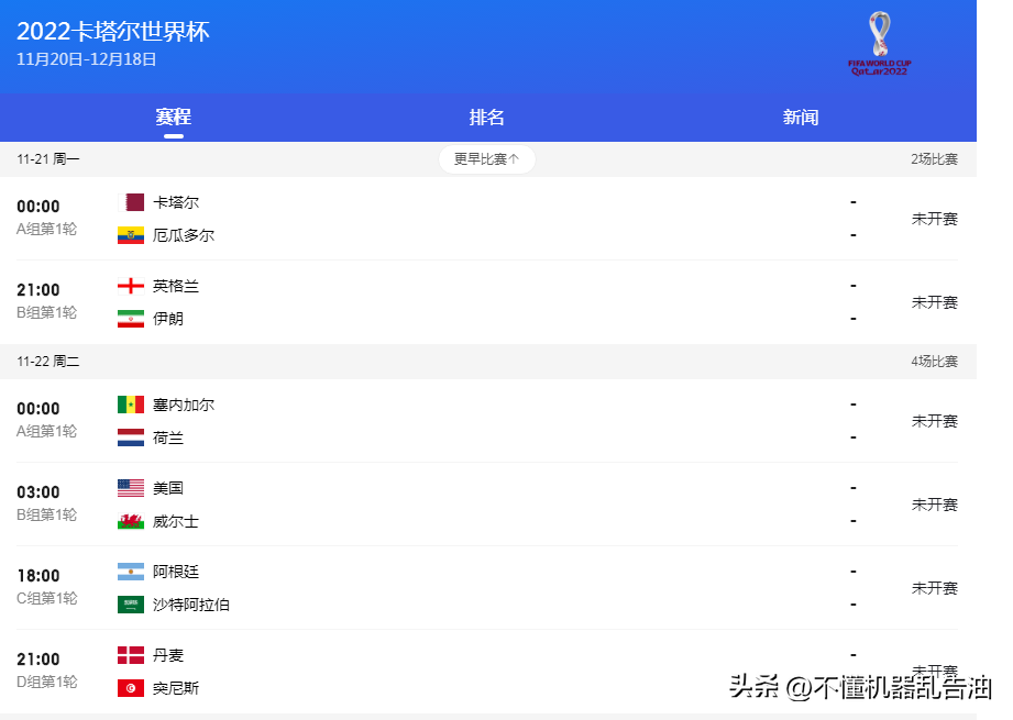 2022年卡塔尔世界杯于11月21日至12月18日举行。