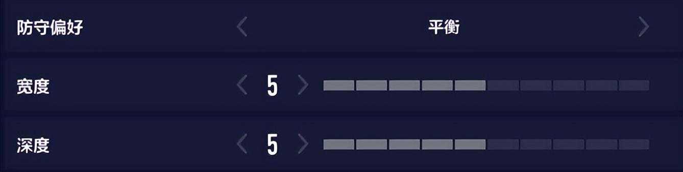 “防守”大项里有三个小项——防守偏好、宽度、深度 。防守偏好如同字面意思,它影响球队的防守思路,也奠定了全场比赛的防守习惯。防守偏好可以有5个选项,“后撤”“平衡”“停球过大时上抢”“丢球后立即反抢”“持续压迫” 。从字面描述看,大家也能感觉出来,防守积极性是逐渐增加的。一般默认用“平衡”,想要稳健防守可以设置成“后撤” 。