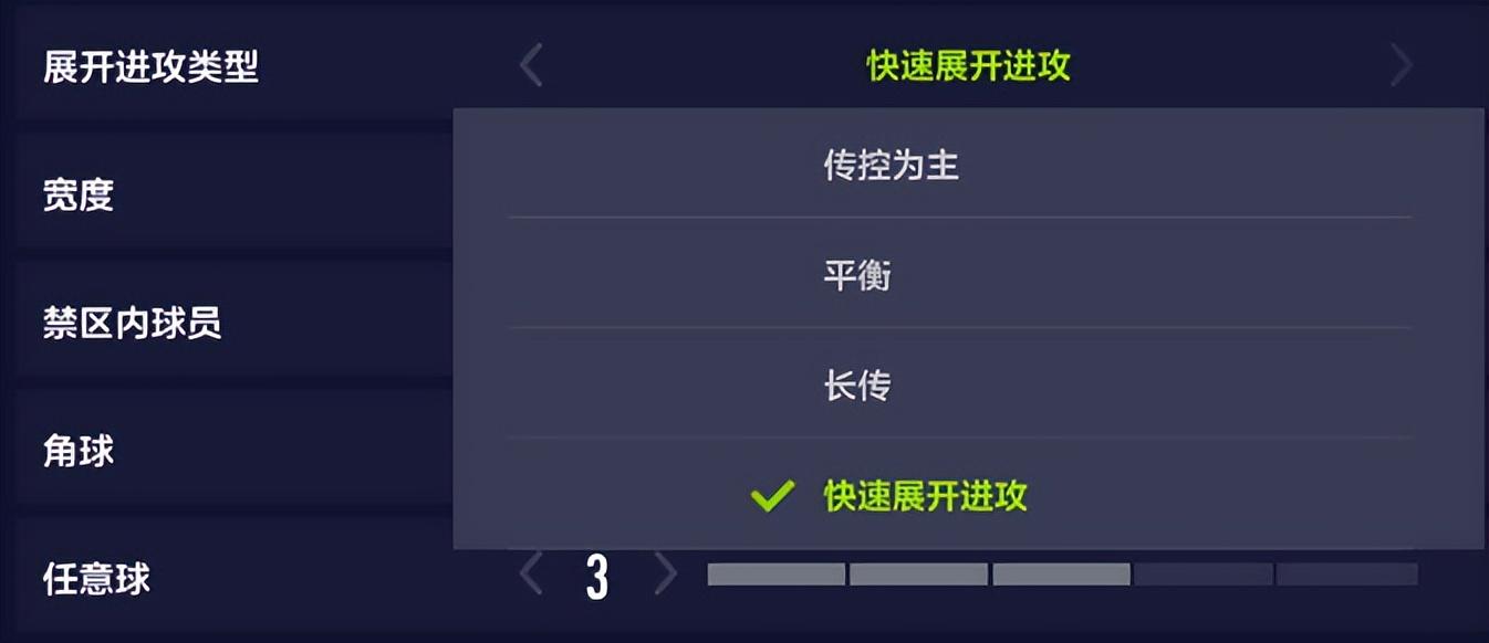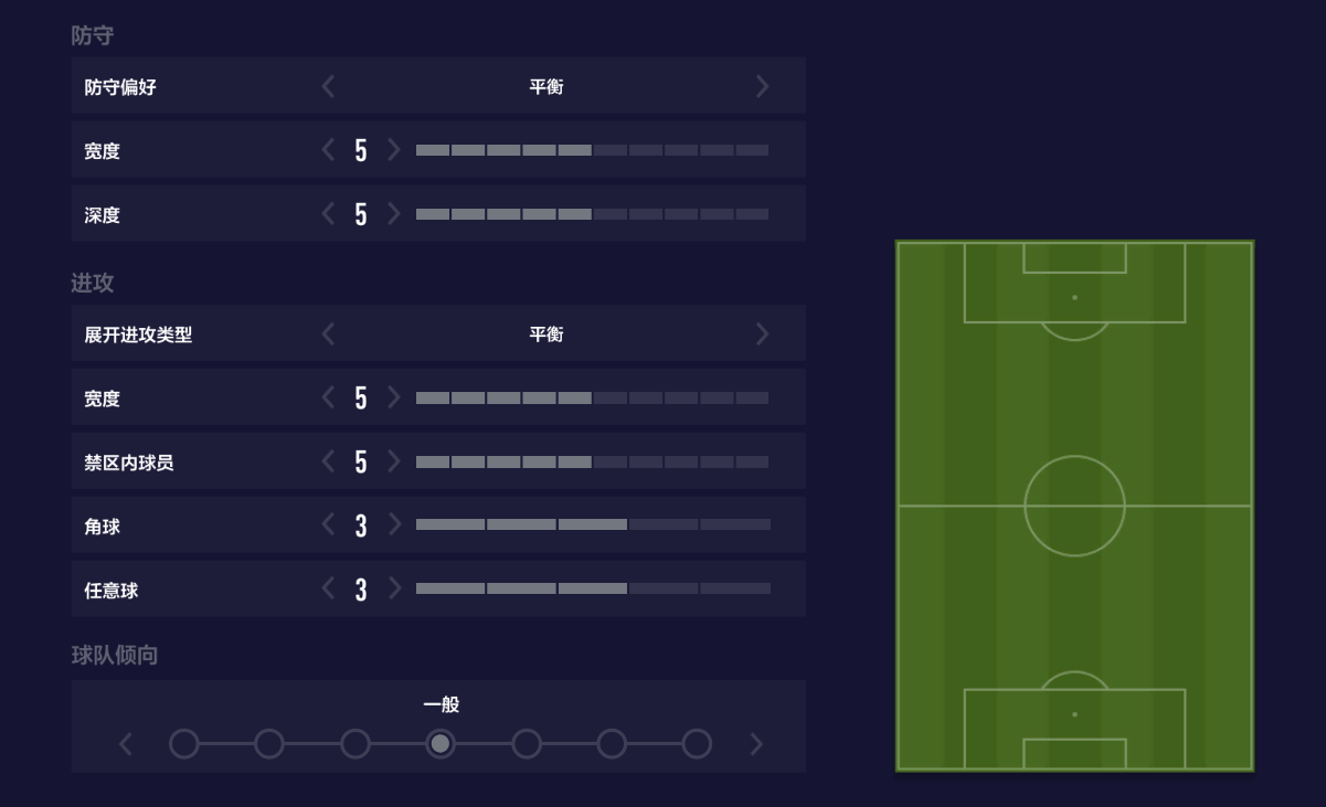角球和任意球,影响的也是,开出角球或任意球后,禁区内抢点的人数。 这两项和上面的“禁区内球员”类似,只是作用的场景不同。一般来说,用默认的3就行,不用再做额外调整,除非你有独特的角球、任意球套路,需要调整接应人数。