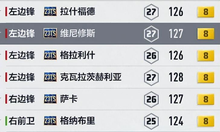当世的顶尖边路超跑都在其中,像维尼修斯、萨拉赫、萨卡、莱奥 等,23TS是他们最强赛季。曼城的“盾锋”格拉利什 ,这是他久违的新卡,出色结实的模型和在边路做支点的特点 ,是其他TS边锋不具备的,富有更鲜明的战术特色,所以这里也做了推荐。
