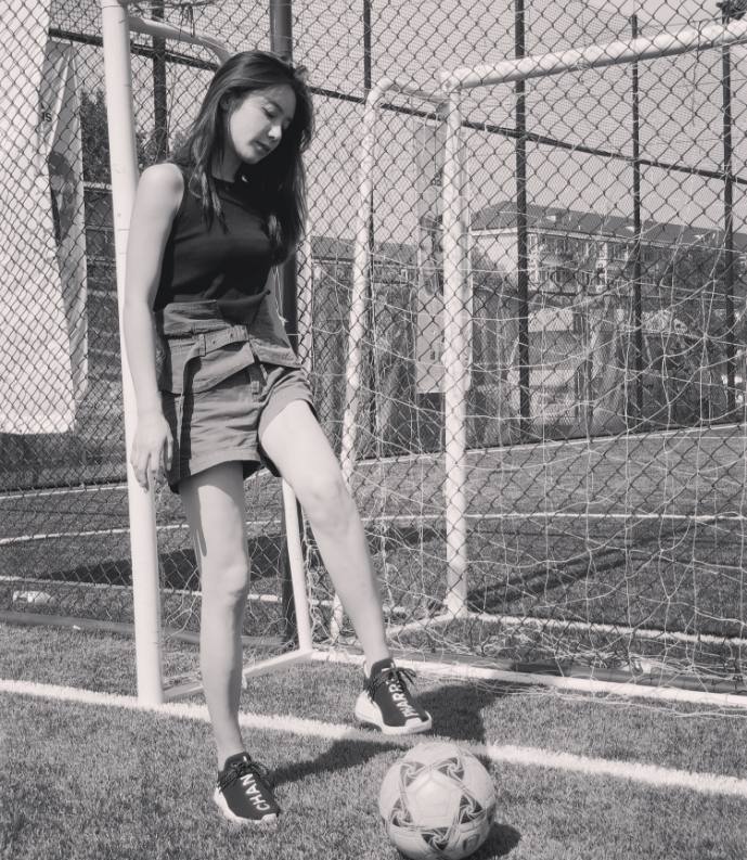 穿着运动装踢球的美娜也不差哦,看这纤细笔直的小腿,一看就是平常没少锻炼。