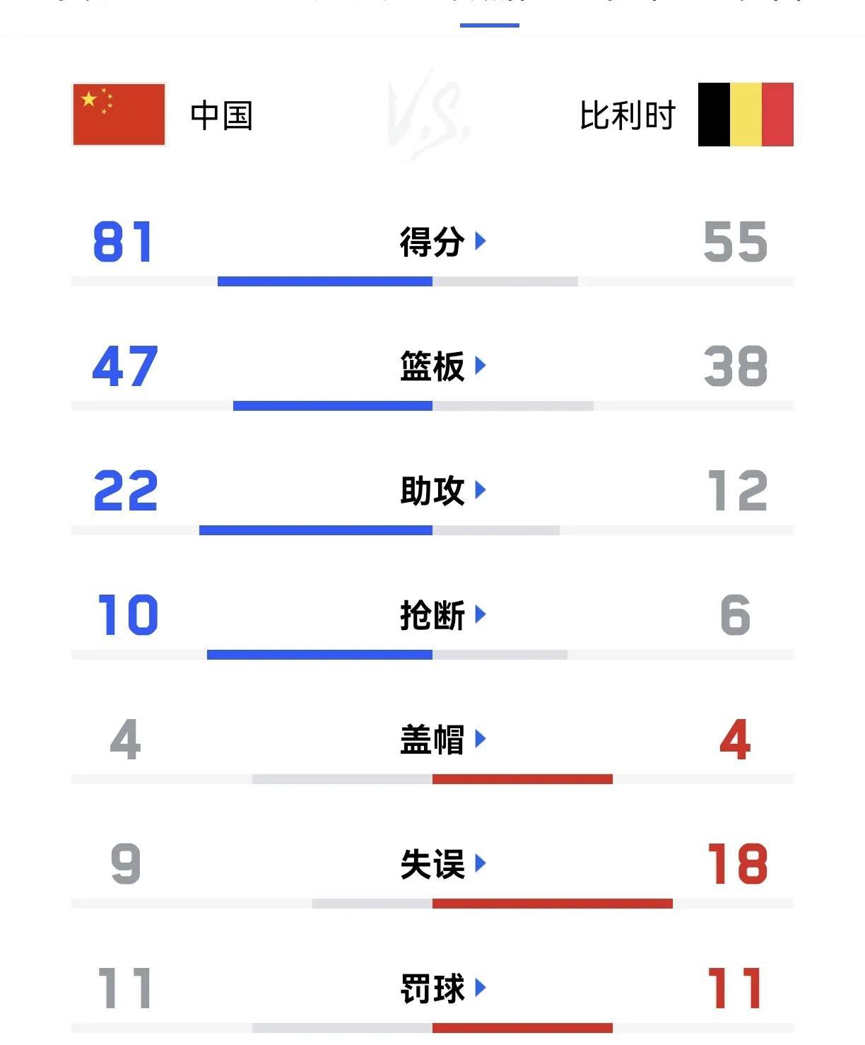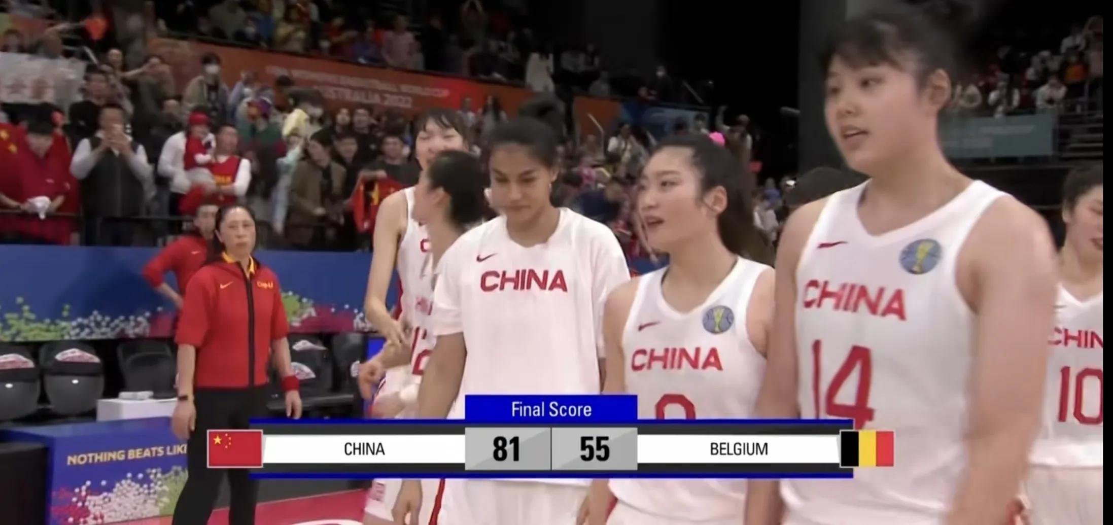 比赛结束,中国女篮81-55大胜比利时26分,以小组第二晋级下一轮。