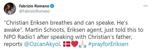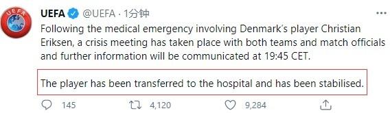 随后,欧足联官方消息,埃里克森已经被转移到医院,情况稳定。↓