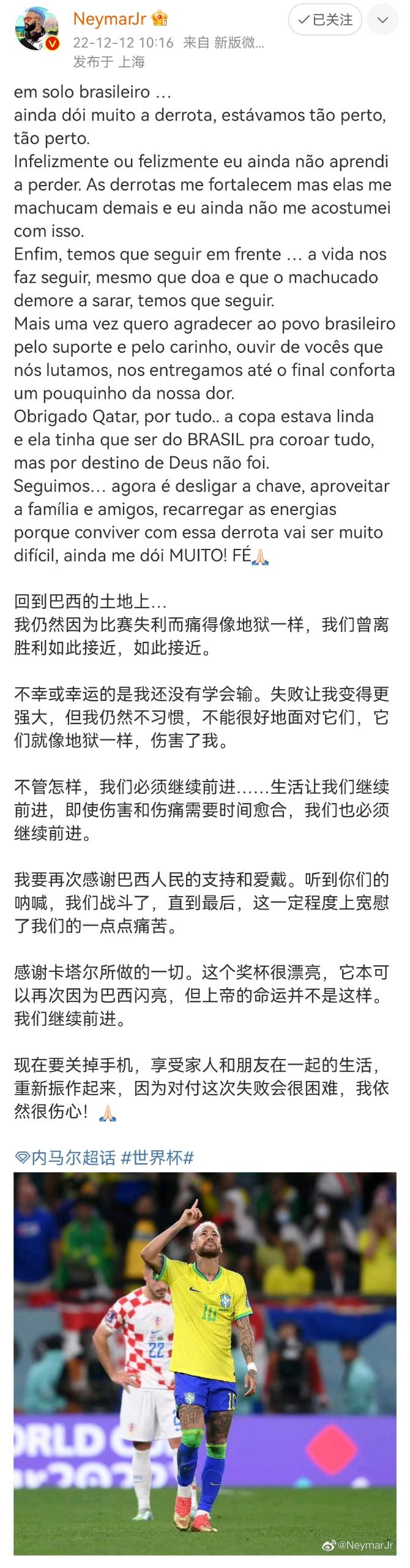 感谢卡塔尔所做的一切。这个奖杯很漂亮,它本可以再次因为巴西闪亮,但上帝的命运并不是这样。我们继续前进。