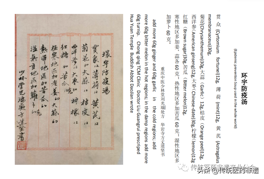 在此次疫情蔓延的初期,重庆中医少林堂刘光瑞引用《黄帝内经》《伤寒论》等医术典籍理论,结合我国的地理环境、气候特点,以及国人的饮食习惯、身体素质等综合性因素,研制了增强体质、提高免疫力的“防疫汤”。