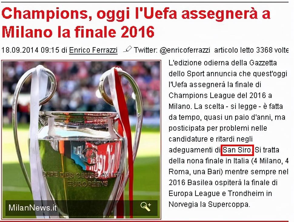 1990年世界杯、2016年欧冠决赛,这座球场打出的名字都是“圣西罗球场”,决赛直播前面向全球对这座球场的官方推介也是“圣西罗球场”。