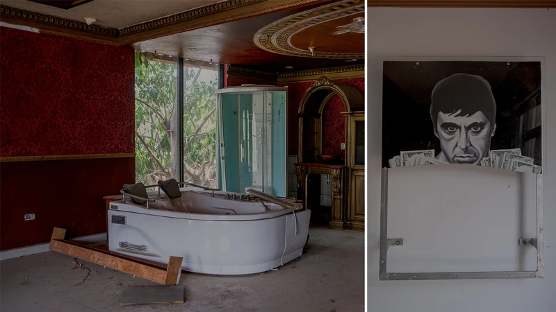 有的房子还能看到游泳池和华丽的雕塑,有些有小型的儿童乐园,有的有巨大的按摩浴缸,有一个毒贩家还挂着“教父”阿尔帕西诺的照片。其中还能看到贩毒黑帮女首领Digna Valle建到一半的房子。