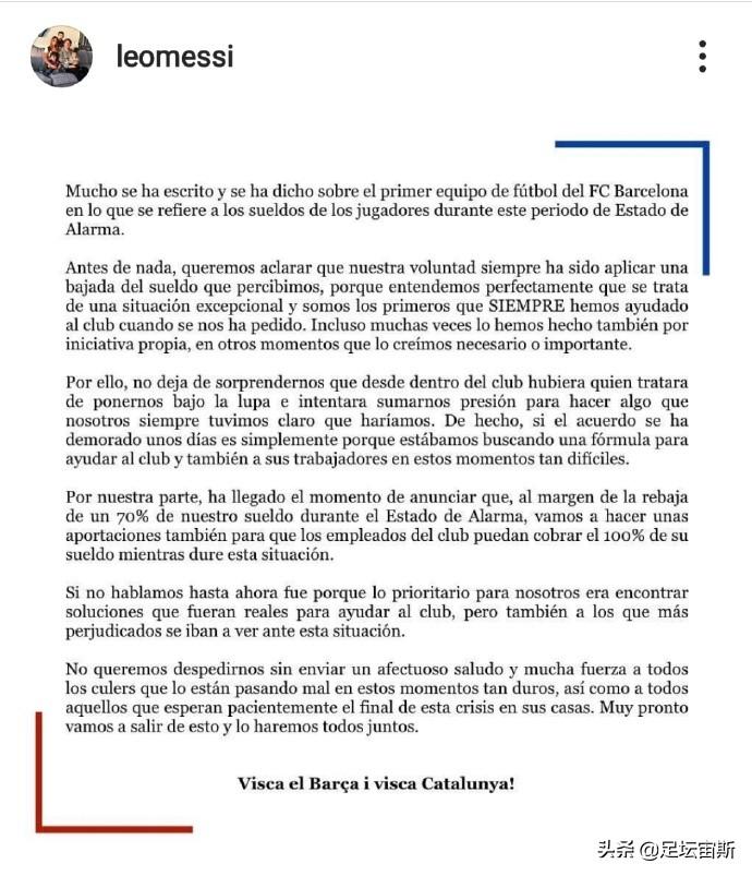 在疫情面前,欧洲豪门球队也开始陆续宣布降薪计划。巴萨队长梅西带领全队一起发表声明,宣布重大决定:同意降低70%工资,还会筹集捐款抗击疫情,并保证其他普通工作人员100%的薪水。