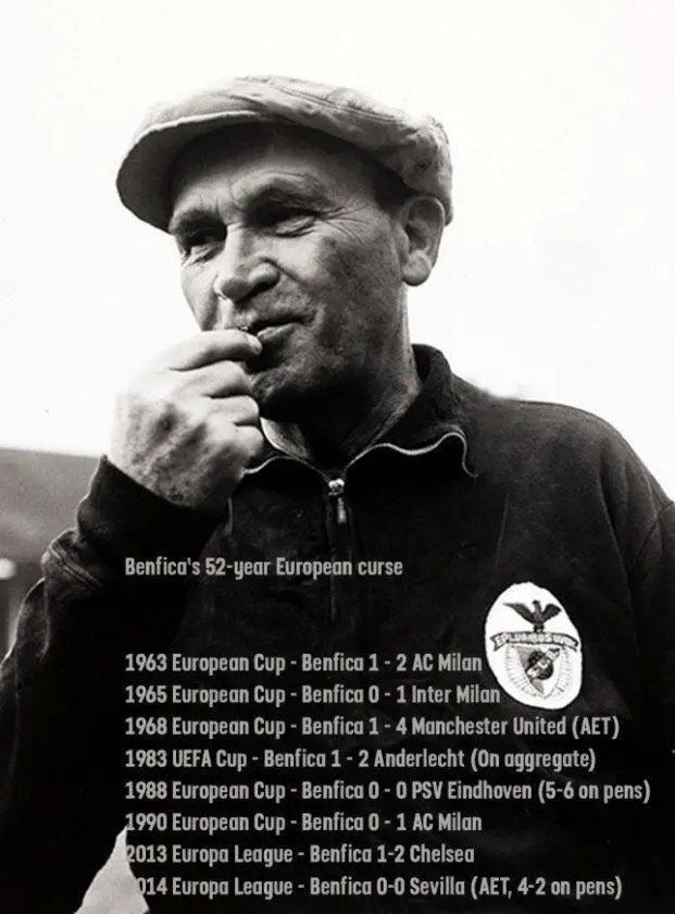 起初这样的言语并没有得到太多的重视,本菲卡高层也只将他视作一句气话。可噩梦却在不经意间来了。60年代,本菲卡依然保持强势,三次打入欧冠决赛,却分别负于米兰双雄和曼联,让这只葡萄牙豪门逐渐跌入低谷后来打入欧战决赛已经是1983年的事了,这一次他们在联盟杯不敌比利时豪门安德莱赫特。
