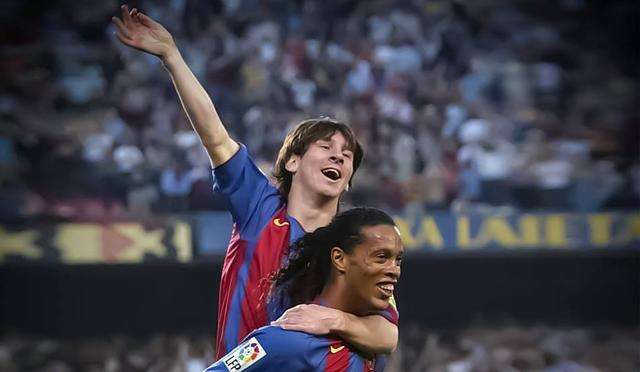 2004年,17岁的梅西进入巴萨一队,彼时,巴萨10号球衣的主人正是如日中天的小罗。尽管两人当时的足坛地位相差悬殊,但作为老大哥的小罗丝毫没有架子,主动帮助内向的梅西熟悉一线队、在更衣室立足,无论场上场下都十分照顾阿根廷球星。梅西巴萨一线队的第一个进球,就来自于小罗的助攻。收获“处子球”后,梅西直接跳到小罗背上庆祝,那是足坛历史名场面之一。