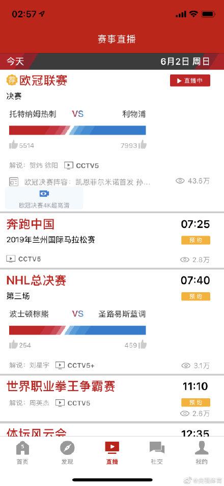 北京时间6月2日03:00,欧冠决赛,热刺对阵利物浦,央视CCTV5体育频道直播。