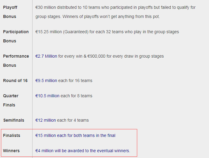2018/19赛季的欧冠奖金池达到创纪录的20.4亿欧元,除了分配一些奖金给参加资格赛和附加赛而未能进正赛的球队之外,剩下19.5亿欧元由32支欧冠正赛球队瓜分。