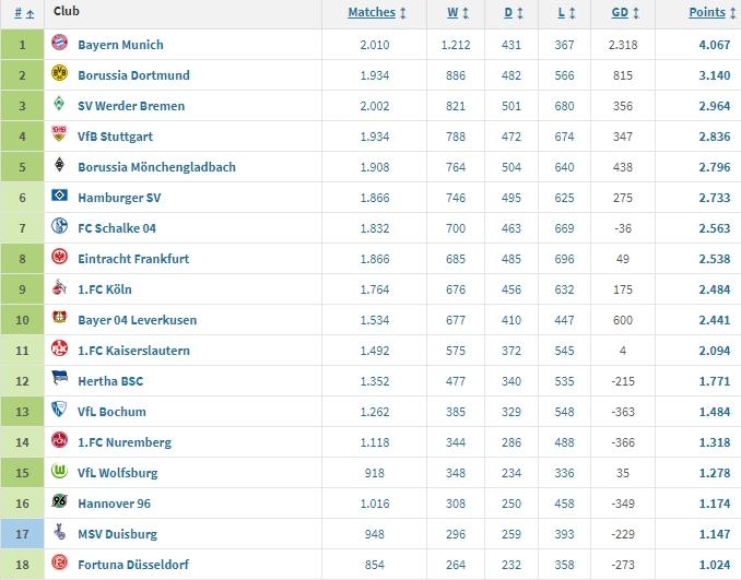 第6/7名的汉堡和沙尔克也是老牌球队,但现在都在德乙联赛。8/10名则是法兰克福、科隆(本赛季降级)和勒沃库森(本赛季夺冠)。11名往后,则几乎都是次级联赛球队了。