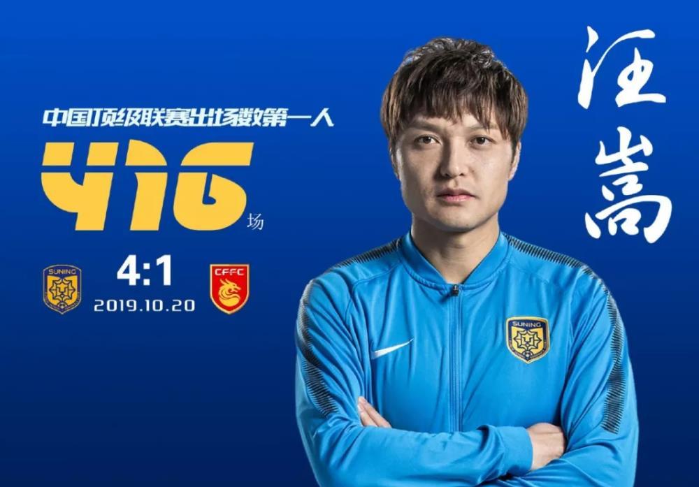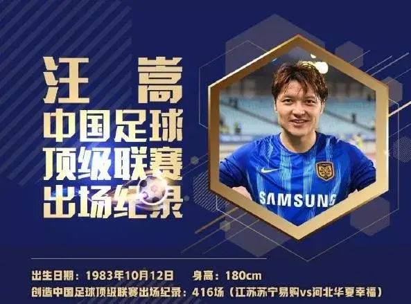 2019 赛季中超第 26 轮江苏苏宁主场迎战河北华夏幸福的比赛,刚刚过完 36 岁生日的汪嵩在第 67 分钟替补谢鹏飞登场,完成了个人在中国职业足球顶级联赛中的第 416 场比赛。汪嵩也就此超越已经退役的前北京国安功勋队长徐云龙,成为中国职业足球顶级联赛出场第一人,如今这个纪录,暂时被定格在417场。如果汪嵩还想将纪录延续,他首先要完成的任务是帮助四川优必选冲超。