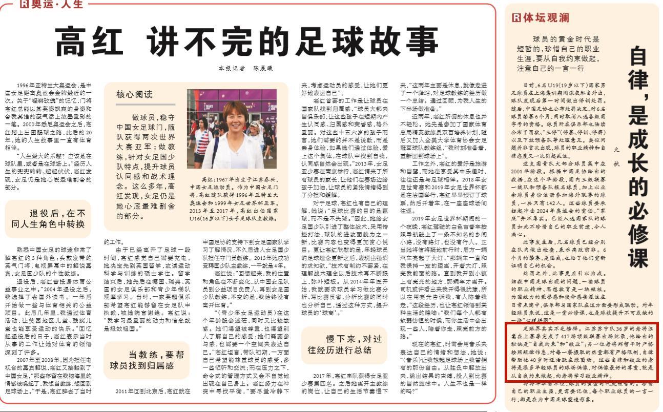 日前,《人民日报》就六名国青队员因集训期间私自外出饮酒被处罚一事发表评论,告诫年轻球员冉冉年华留不住,要好好珍惜职业生涯。同时,文章还专门提到了恒大 40 岁的 “足坛常青树” 郑智以及前不久转会至中甲新军四川优必选的 36 岁老将汪嵩。《人民日报》在文章中这样写道:足球界其实不乏榜样。江苏苏宁队 36 岁的老将汪嵩在上赛季完成了 417 场顶级联赛出场纪录,他给出的秘诀是 “自我约束” 和 “敬业”。