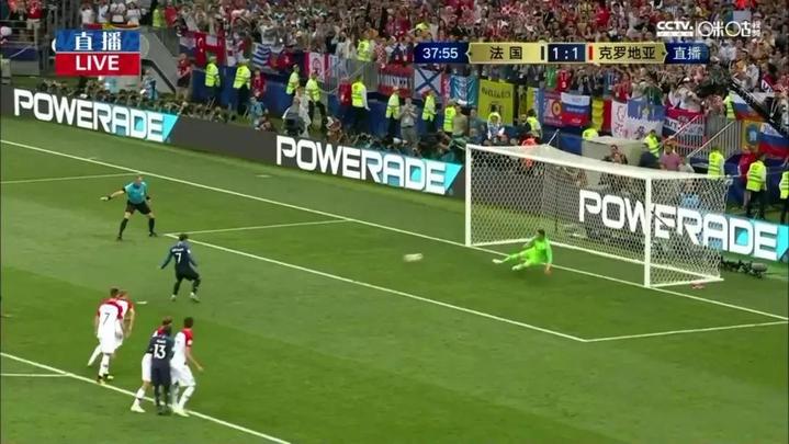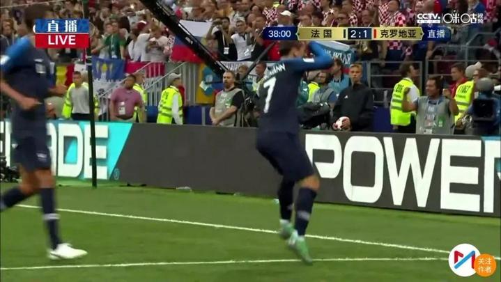 第38分钟,佩里西奇防守角球时手球,裁判观看VAR后果断判罚点球。格里兹曼轻松骗过门将罚中,法国队2-1再次领先!