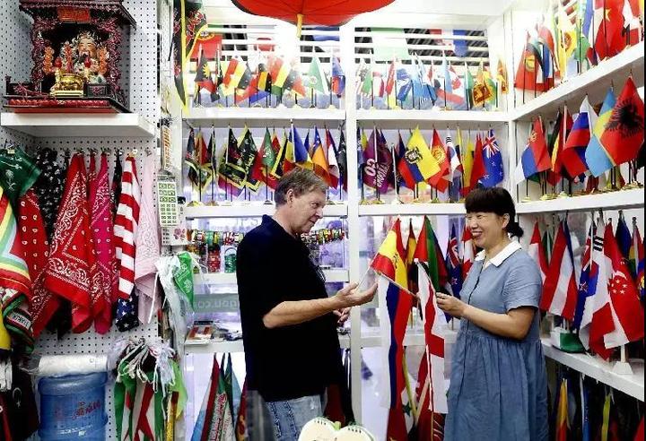 图为瑞典商人在国际商贸城采购国旗。