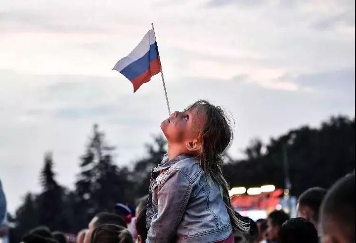 图为八强赛前,一位小球迷嘴含俄罗斯国旗在场外助威,这面国旗也是义乌制造。