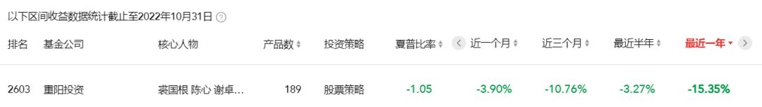 据私募排排网,重阳投资主打股票策略。截至2022年10月31日,最近一年收益率-15.35%,排名全行业第2603位;在准百亿私募中,重阳投资排名第46位。