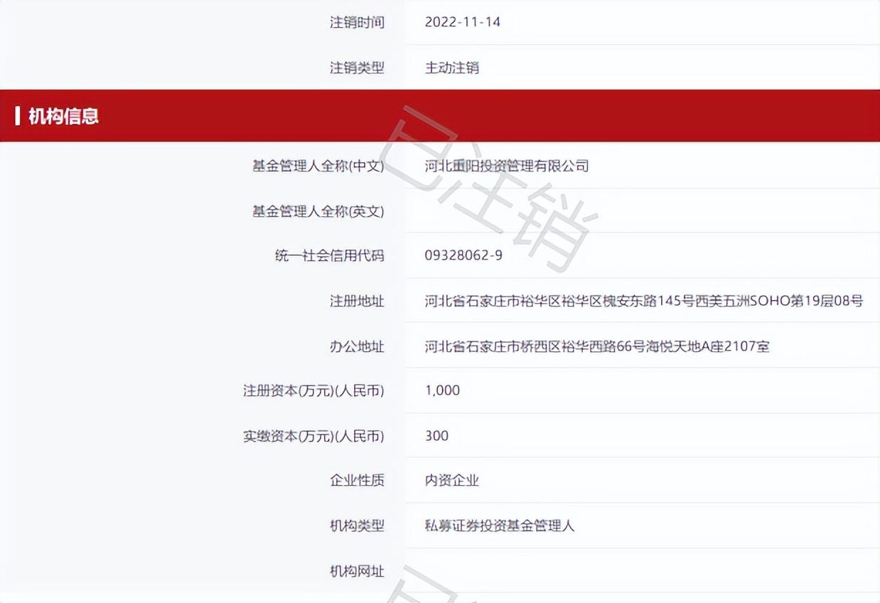 据中基协已注销私募信息,河北重阳成立于2014年3月6日, 2015年11月12日备案登记,2022年11月14日主动注销。