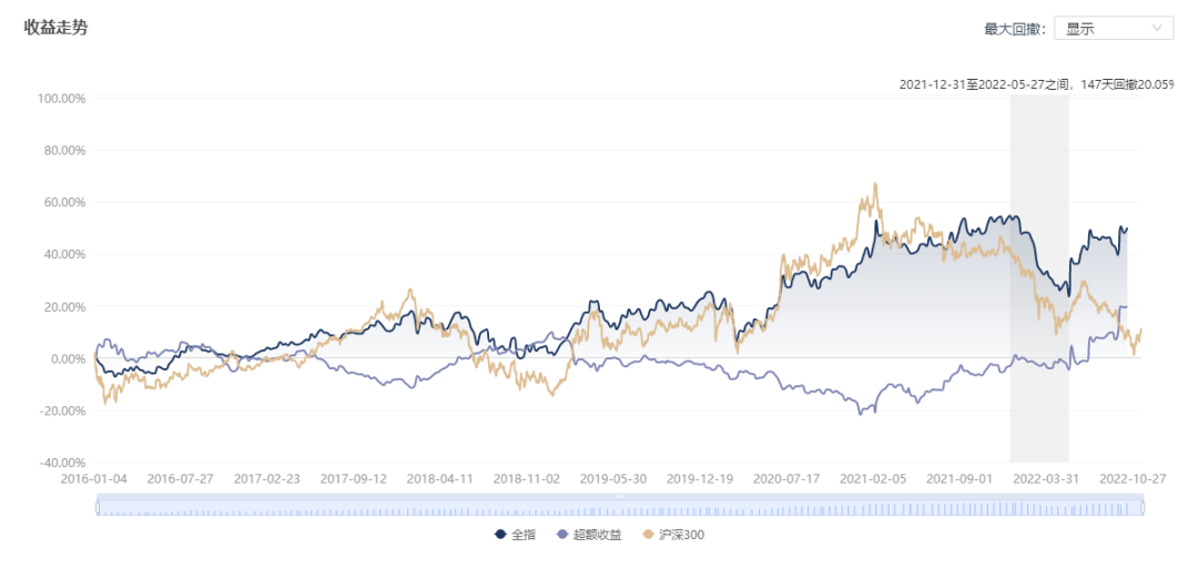 川谷信息显示,重阳投资今年以来整体收益率为-2.94%,表现依然优于沪深300(-22.22%)。而从最近十年的历史数据来看,重阳投资的最大回撤发生在今年年初,147天回撤20.05%。