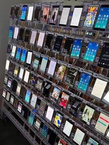 王某机房中密密麻麻地排列着多部手机一同“工作”。