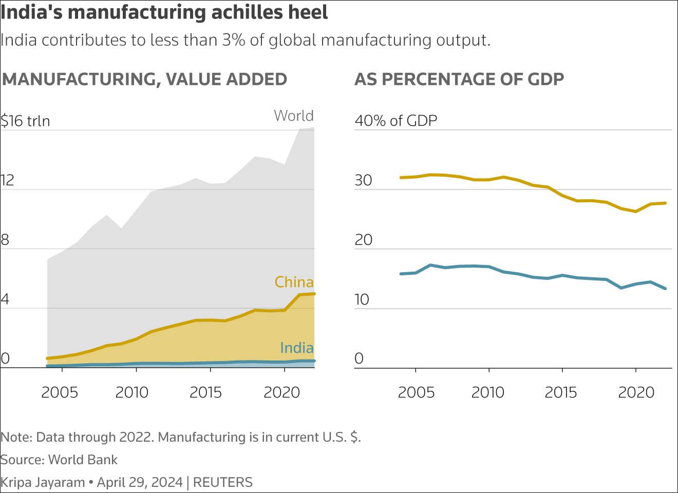 印度和中国制造业分别在世界和本国经济中所占份额(路透社)