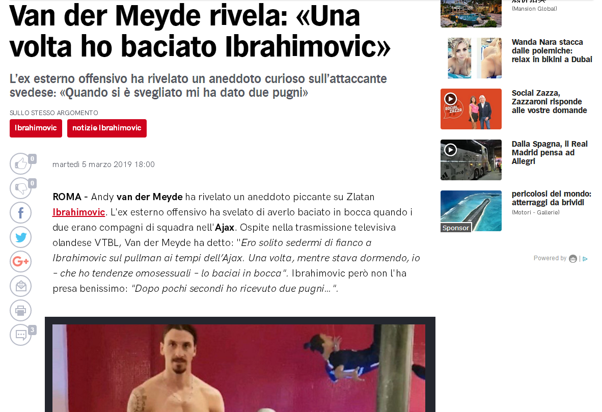 伊布在阿贾克斯时期的队友、荷兰边锋范德梅德最近在做客VTBL电视节目时透露了一段当年的糗事:“阿贾克斯时期,在球队的大巴车上,我通常会坐在伊布旁边。有一次,当他正在睡觉时,因为我有同性恋的倾向,因此忍不住吻了他的嘴。几秒钟后(他醒来),我就被揍了两拳……”