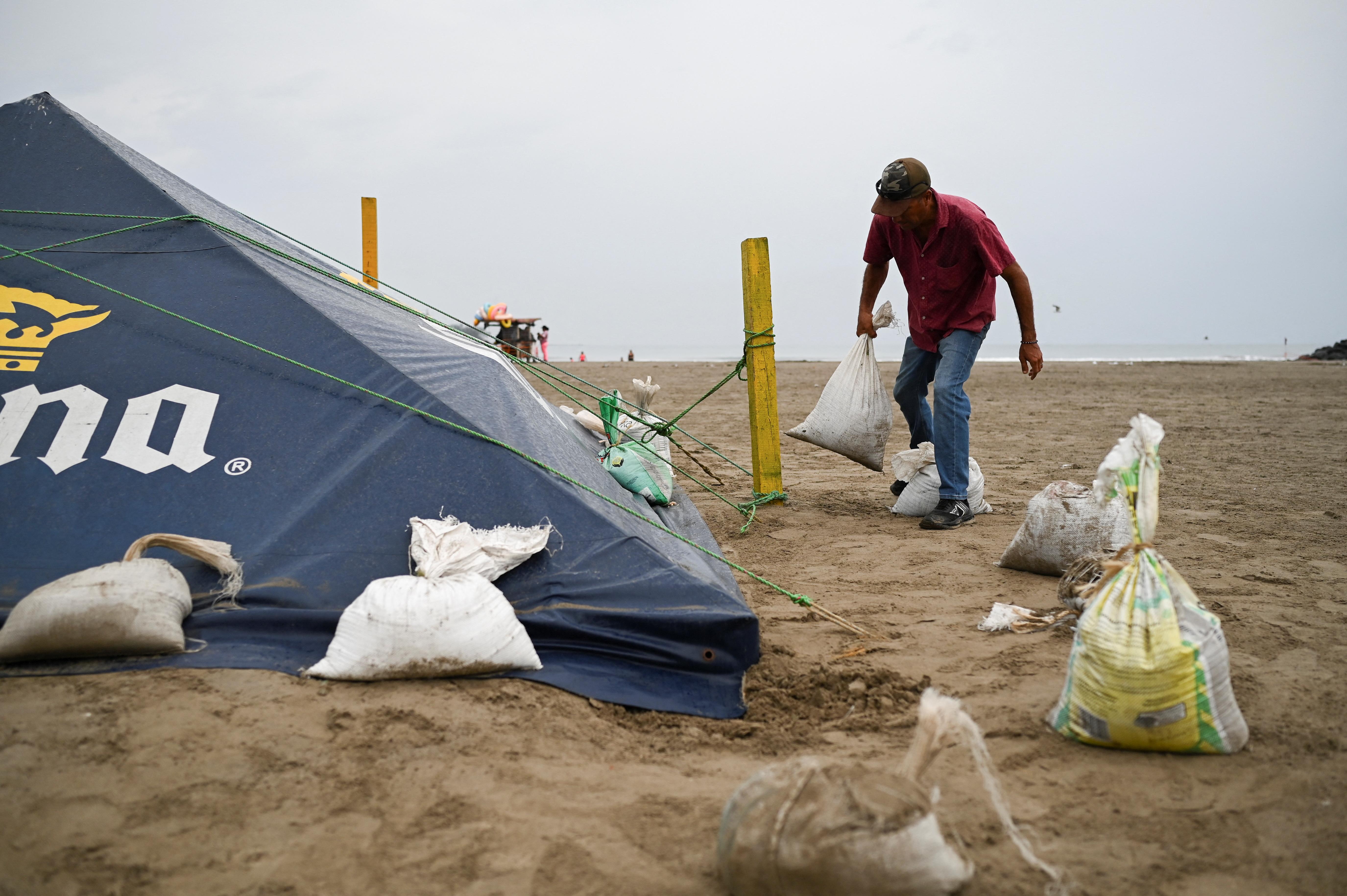 6月19日,在墨西哥韦拉克鲁斯,一名男子用沙包压住帐篷。 新华社/路透