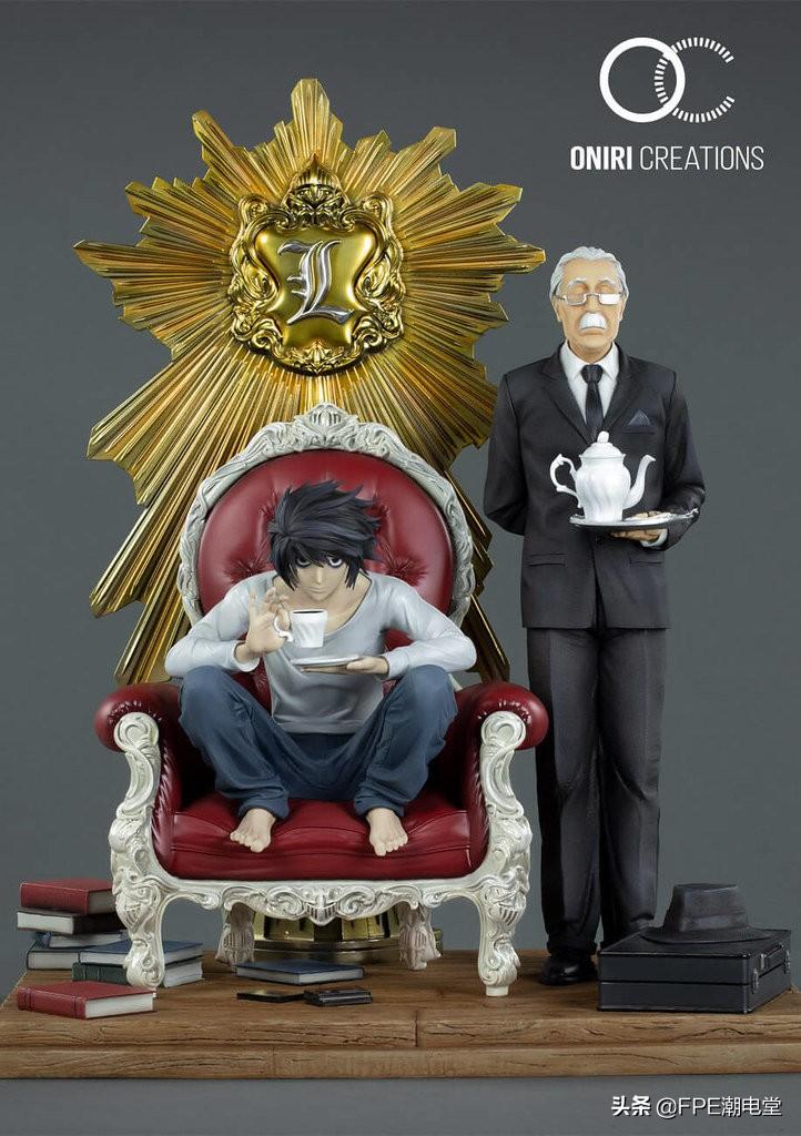 以L和他的助手渡为主角,重现L怪异坐姿与正在喝茶吃甜食的独特姿势,另一旁的渡手中捧着茶壶,还原两人剧中之间的相处模式。L身穿招牌的白T与牛仔裤,渡一身正经西装,造型相当还原。整体尺寸为42cm x 26 cm x 34 cm,L专属的红沙发雕刻相当精致,并以 L 的标志作为背景,摆设起来更有气势。木纹底座散落着书本和录音带的场景也充满L的风格。全球限量999体,皆有附正品证明书。