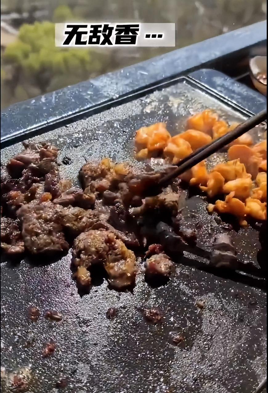 赵继伟专心致志地拿着筷子在烤肉,香气四溢。