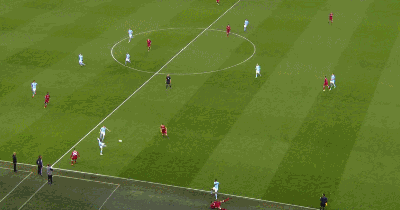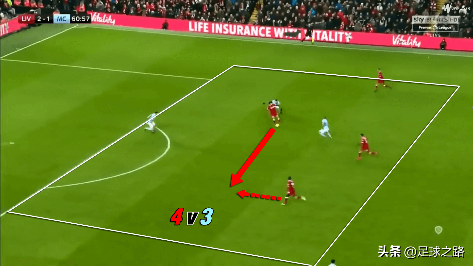 我们看下面的场景,利物浦高位压迫之后得分,当这名利物浦球员拦截传球时,对方只有两名后卫在球后参与防守。