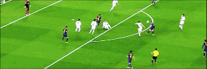 如上图所示,这是穆里尼奥麾下的皇马,面对巴塞罗那时完成的一次反击。在禁区边缘断球后,皇家马德里队中场球员在右侧直接一个大脚斜向45度传球准确的衔接到左侧前插的队友,并最终取得了破门。