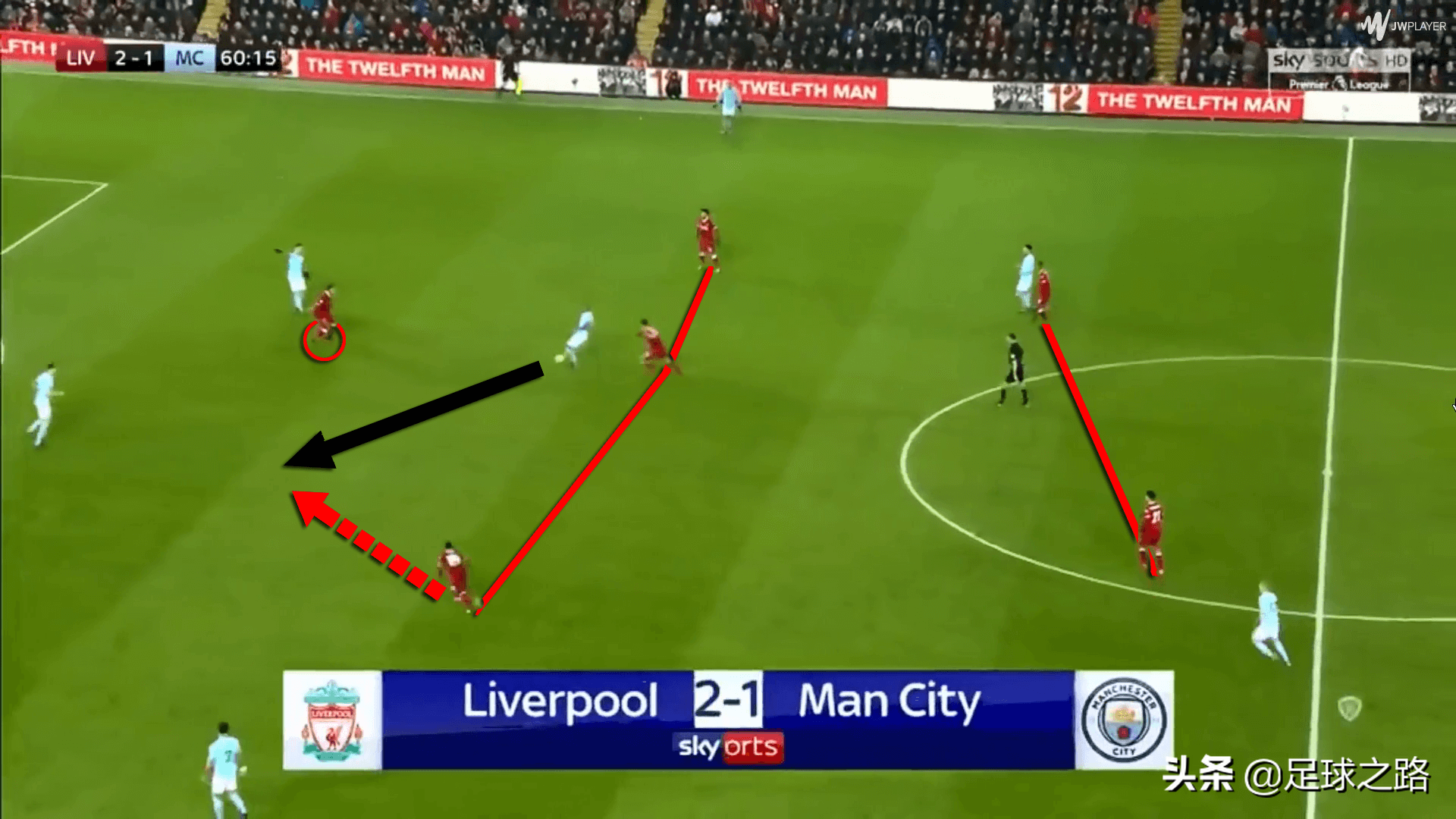 有了这一策略,利物浦能够在接近球门时,人数上超过曼城的防守队员。和低位的防守一样,在重获球权之后,也需要有足够的中场球员来支持反击。