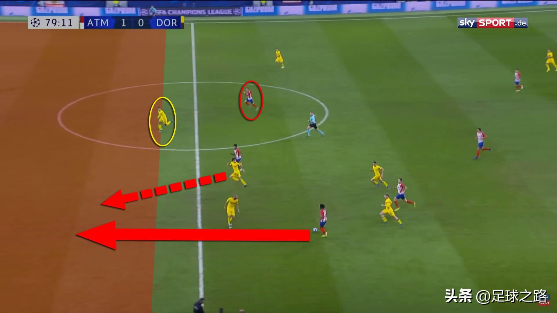 正如上图所示,马竞非常喜欢利用防线身后的空间进行反击,而这种反击形式,很重要的一点是,在反击中要有足够的球员在场上移动支持这次进攻。