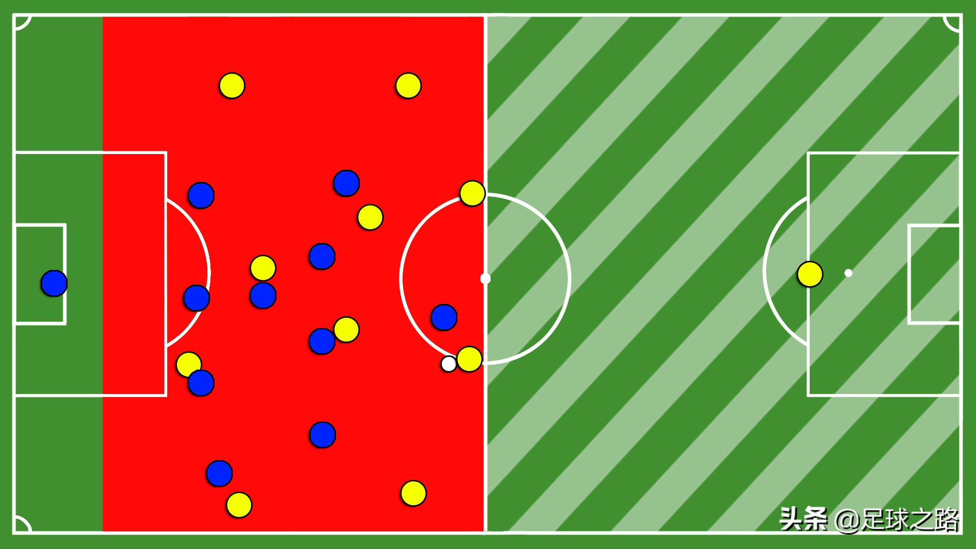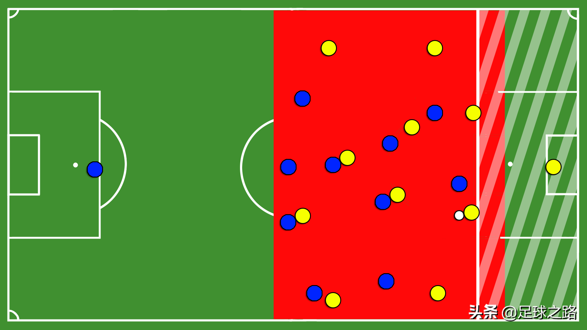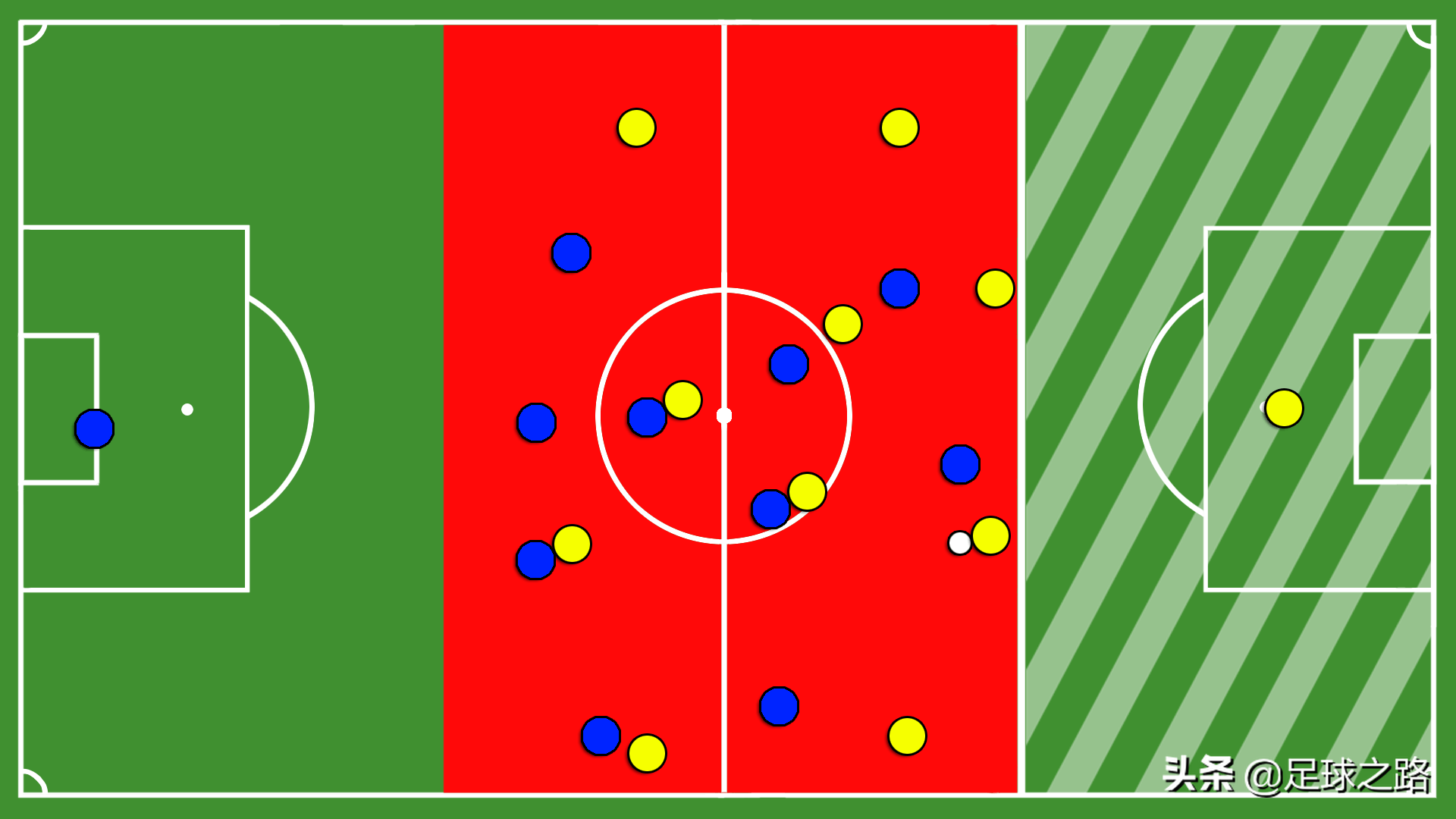 中段压迫在最后一条防线身后保持相对的空间,据对方球门的距离不像低位防守那么大,中段压迫较高位压迫有更多的空间可以利用,还另一个重要的原因是,自己的防线后面的空间没有那么大。因为如果我们采取高位压迫,本方后卫速度不够快,无法跟上对手前锋的脚步,那将是灾难性的结果。