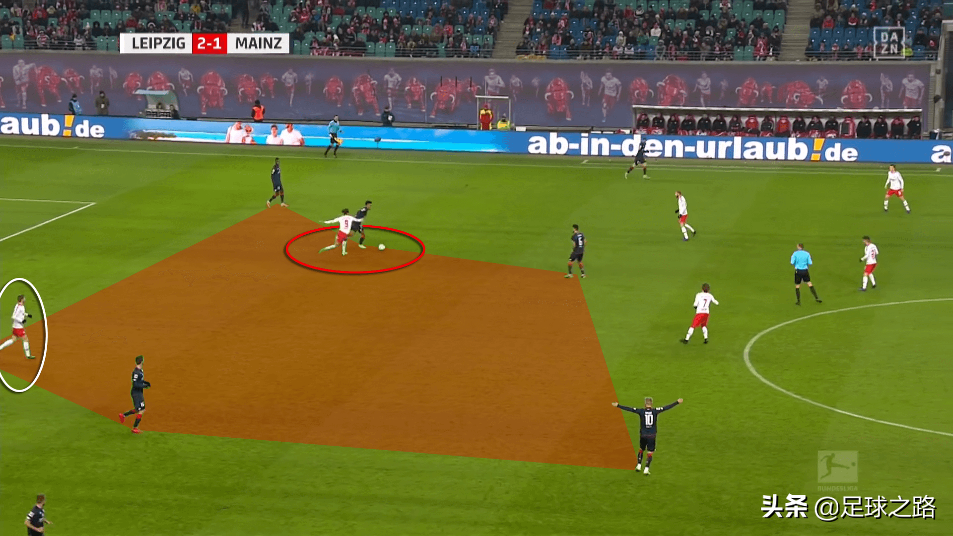 但这也意味着在失去控球后,每个球员都需要快速的从进攻行为转换成防守行为,在下面的场景中,我们可以看到莱比锡在对阵美因茨时一个反击的例子,美因茨向前组织正在打开阵型,这在中路提供了很大一块无人区,莱比锡一名前锋开始压迫,维尔纳在前场随时准备反击,最终导致美因茨传球失误,莱比锡正是利用这块无人区进行了快速反击的渗透性传球,让维尔纳最终破门得分。